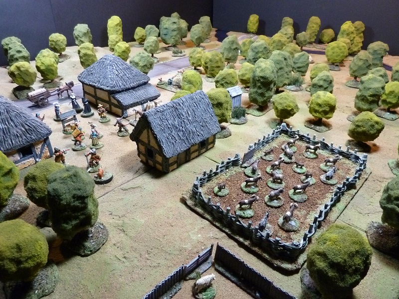 I’m still determined to try the rolling table, by moving the action along the squares of terrain and when they exit one full set of tiles on the left remove them, and move all the remaining tiles to the left and add a new set on the far right. The table is 3 x 4 with all my sponge trees on it, and you can just see the river and bridge at the top of the picture, right side of the board.