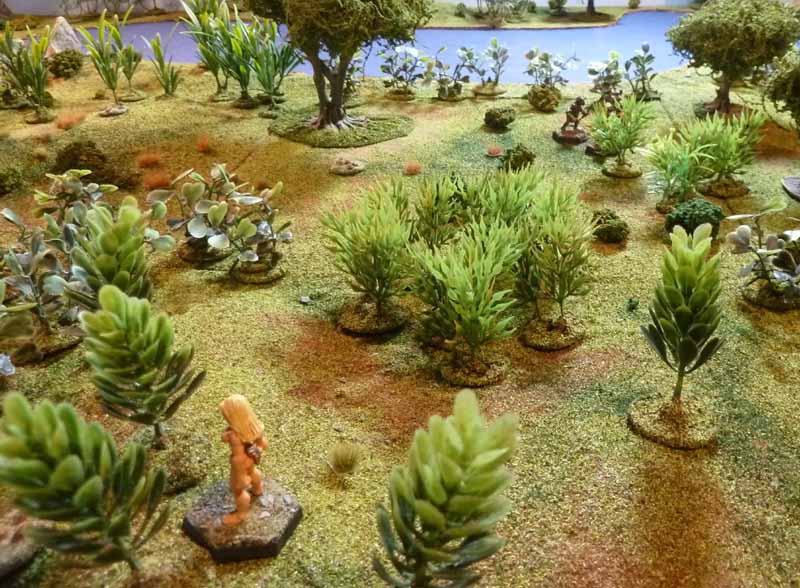 She pelted it with her sling but missed and the sheep ran away. She failed her next activation and it continued to move away. She decided it was too dangerous to follow it across the open ground in sight of the pygmies, even though they were preoccupied skinning and butchering the sheep they had killed. So she continued towards the blasted tree and the offering stone taking care to keep well hidden. There is another thicket in front of her and hopefully she will find more food there.