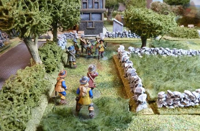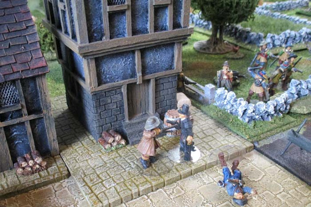 Moving stealthily forward they see that Sir Francis has arrived at the east side of Much Pidding, there, he takes up a defensive line, and watches his troops make short work of the Royalists.